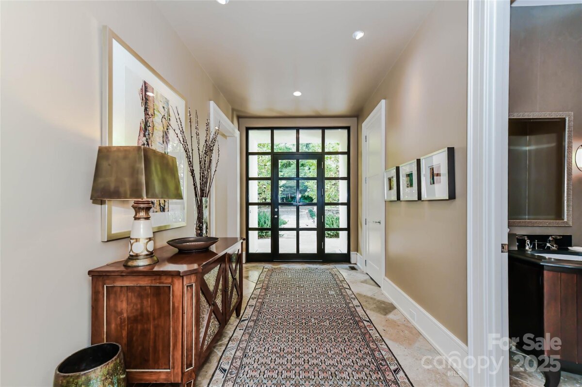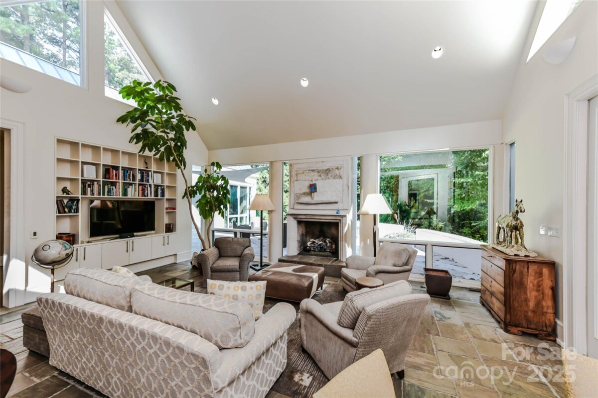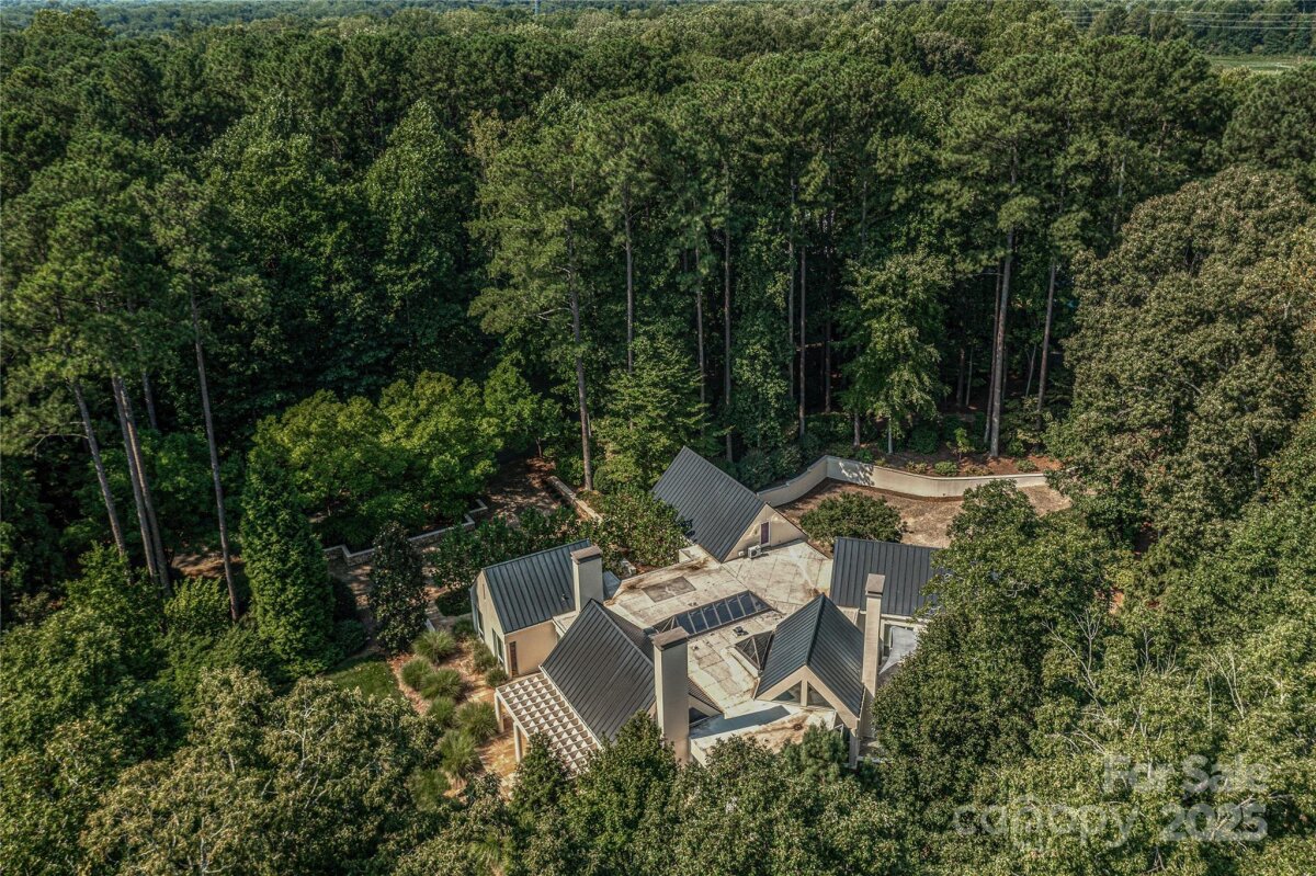 Located just 1.5 miles from downtown Davidson, 606 Ardrey Circle is one of the area’s most beautiful homes! The owners took great care in planning every single detail and have lovingly maintained it. The exquisite residence sits on a private 2.64-acre property, enveloped by gorgeous, mature trees. The property is absolutely beautiful, with a grassy lawn, stone walls and steps, woodland paths, stone firepit, sculptures and multiple spaces to relax. One of the most stunning features is a large stone waterfall that is visible from inside the house. There is ample room for a large pool and pool house. Built by Gene Keener (Fine Homes), the modern home was designed by Charlotte architect Jim Meyer and blends in perfectly with the natural surroundings. Light is abundant in each room and outdoor spaces abound. Most of the living space is on the main level, including 4 bedrooms and 4 & 1/2 bathrooms. The oversized, custom glass front door is surrounded by transoms and leads to a gracious entrance hall and spectacular central gallery atrium with glass ceiling. The house is composed of six pods around the central living space. The spacious living room/ dining room is vaulted and features 2 wood burning fireplaces and a wall of French doors that open to a generous stone veranda with pergola with a lovely trellis ceiling. A partially covered tile patio off the great room offers an amazing view of the waterfall and the surrounding forest. The great room has a wood burning fireplace and built-in bookcases and is open to the kitchen, which has honed granite counters and stainless steel appliances, including a gas stove and stainless steel vent. A large butler’s panty for additional storage and counter space is adjacent to the kitchen. Ten foot ceilings downstairs, tall wood doors and built-ins add to the comfortable, elegant feel. The stone flooring in kitchen, family room and all 3 full baths is heated. The two primary bedrooms are located near the great room and back hall which leads to an oversized 2 car garage. A spacious laundry utility room is conveniently located there along with back stairs that lead to a bonus room and loft area. Two additional bedrooms with en-suite bathrooms are off the foyer. There are two wells on the property that provide water for the waterfall feature & irrigation for the gorgeous grounds. 606 Ardrey Circle is an amazing home in a truly phenomenal location in the heart of Davidson.