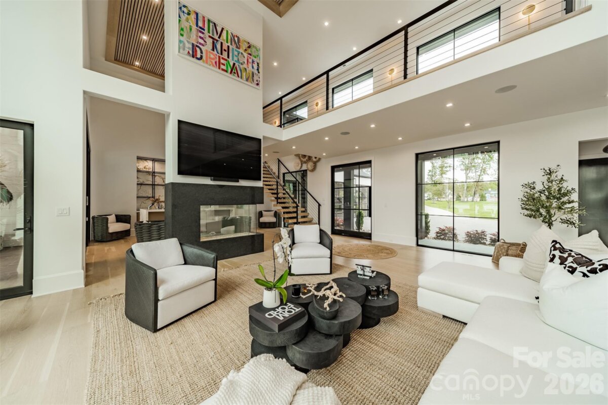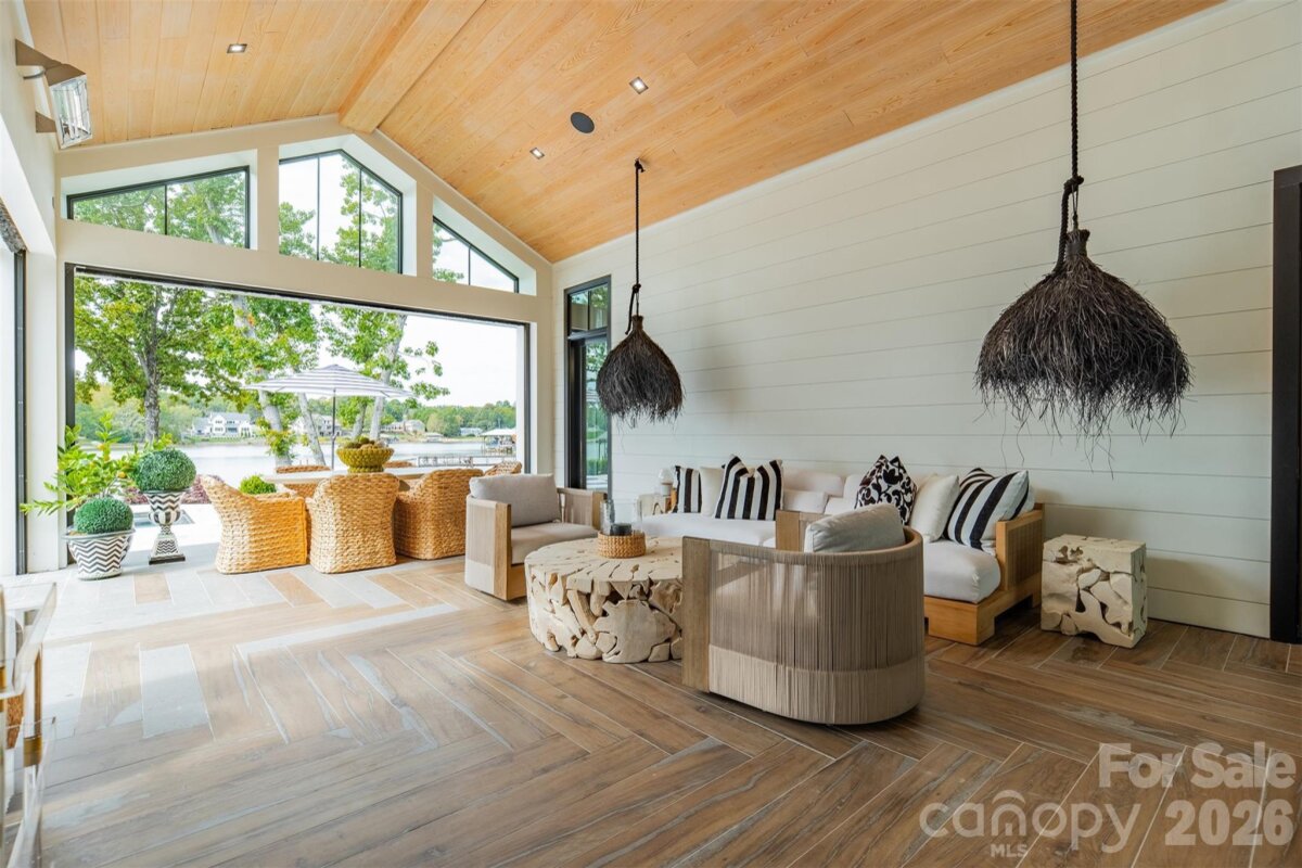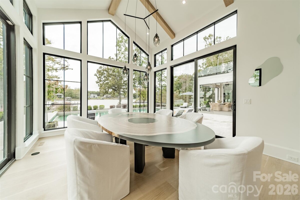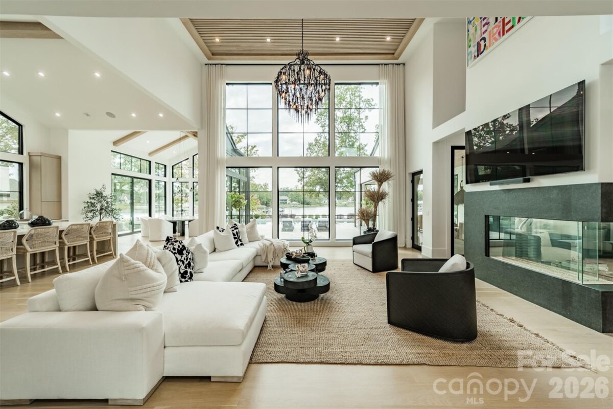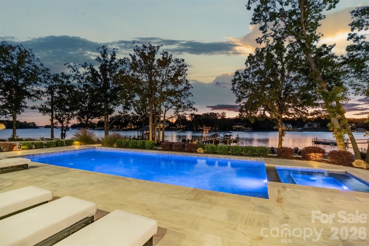 Step into a world of sophistication in this stunning contemporary home. This architectural marvel, custom-built by Courtland Homebuilders, boasts soaring ceilings & walls of windows flooding the space with natural light. Unparalleled lighting collection, world-curated with the finest craftsmanship. The open-plan main living space is a state-of-the-art entertainment area that seamlessly connects to a travertine patio and pool deck with a saltwater pool and outdoor kitchen, all overlooking Lake Norman. Experience year-round comfort in the remarkable four-seasons room, with versatile, remote-controlled panels. Luxurious top-of-the-line materials used throughout such as porcelain counters with waterfall edges and Phillip Jeffries wallpaper. Primary and guest suites on the main level. Upper level with loft, spacious rooms, office/6th bedroom, and lounge area with bar. 2 heated/cooled show garages, a beach, fire pit, and a pier with boat slip. This property redefines luxury lakeside living!