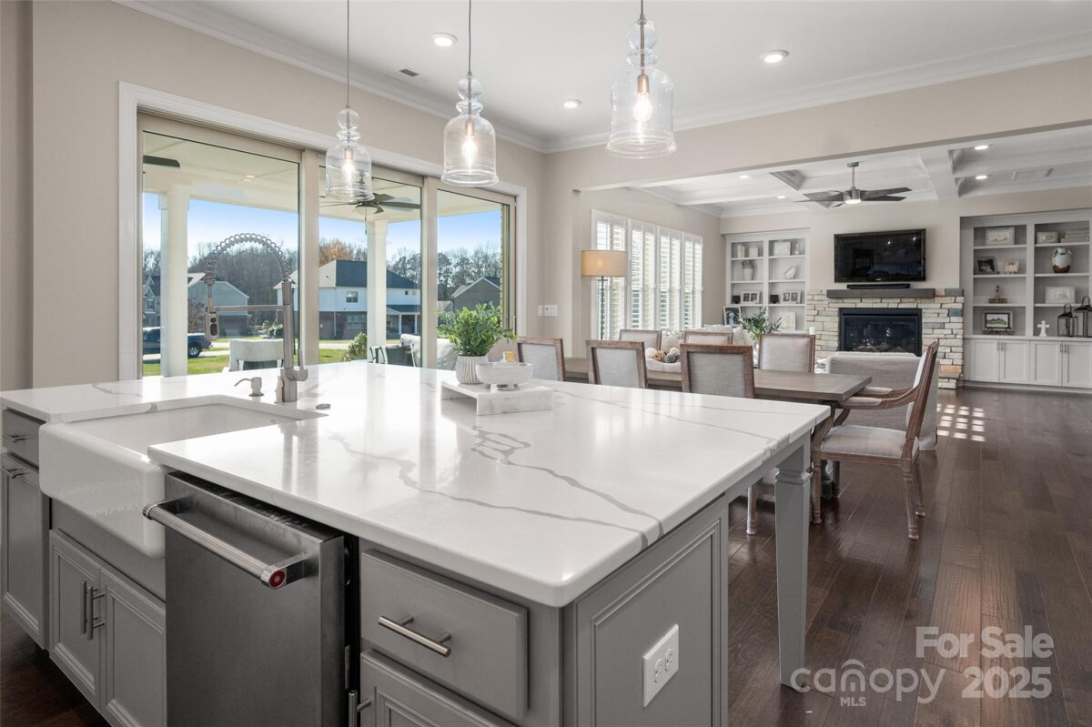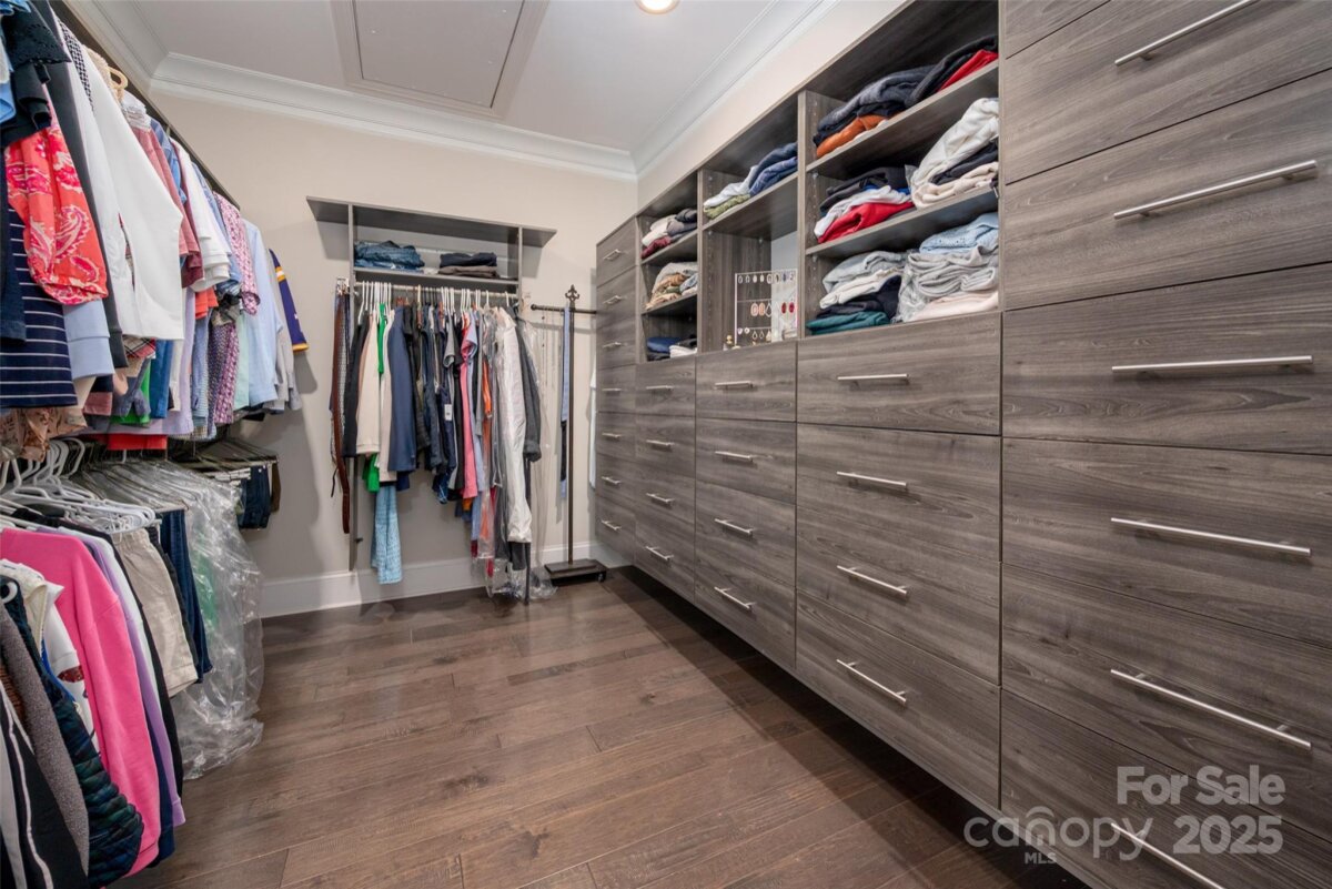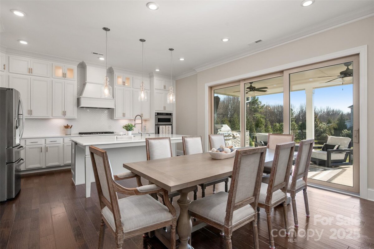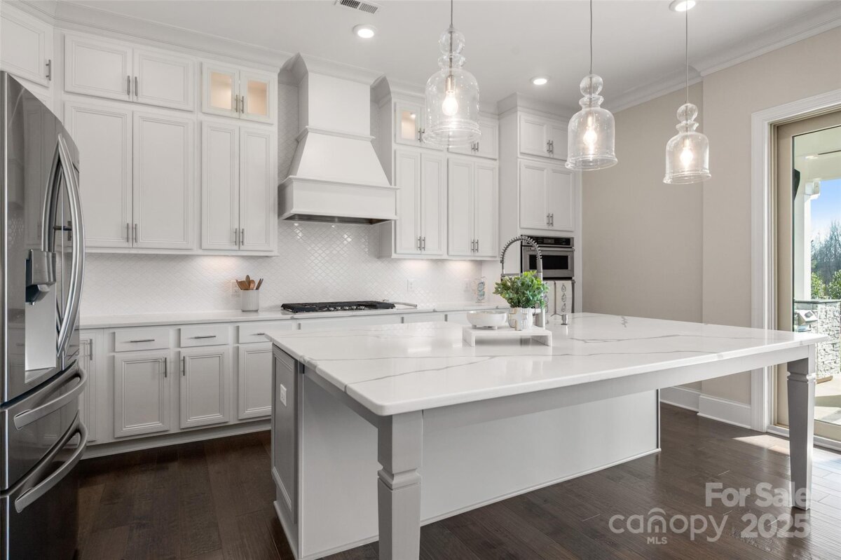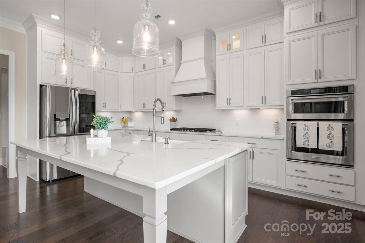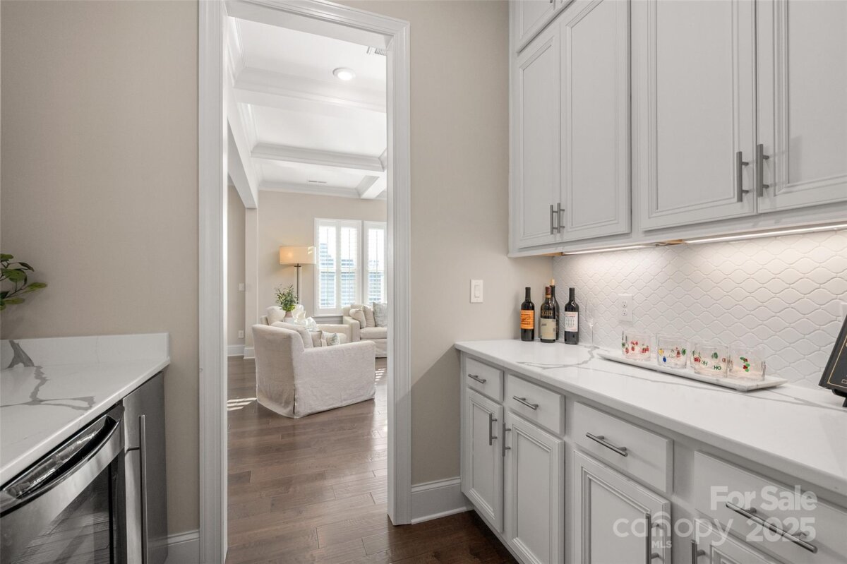 Welcome home to this luxury 5-bedroom, 4.5-bath residence located in the gated community of Highclere, one of Marvin’s premier neighborhoods. Offering nearly 5,000 square feet of refined living space, a 3-car side-load garage, and abundance of custom details, this home blends elegance with exceptional functionality. A grand foyer welcomes you with soaring two-story ceilings, setting the tone for the sophistication found throughout. The main level features 10-foot ceilings, while the upper level offers 9-foot ceilings, all accented with crown molding and custom trim details. The white chef’s kitchen boasts stacked cabinetry, a gas cooktop with wall oven, and an oversized center island ideal for additional seating. Overlooking the dining area and stunning family room, the kitchen creates an exceptional flow for entertaining. A formal dining room connects to the kitchen through a beautifully appointed butler’s pantry, complete with a wine refrigerator and ice maker. The family room showcases a coffered ceiling, custom built-ins flanking a striking stone fireplace, and abundant natural light. A second primary suite on the main level offers a private ensuite bath—ideal for guests or multigenerational living. A home office tucked just off the foyer provides a quiet and functional workspace. Upstairs, the primary suite is a true retreat, featuring an oversized bedroom with a tray ceiling, his-and-hers walk-in closets, and a spa-like ensuite bath with a spacious walk-in shower and freestanding soaking tub. A highly sought-after bonus room offers flexible additional living space, perfect for a media room, playroom, or lounge. A private guest suite includes its own bath and large closet, while the Jack-and-Jill bedrooms offer generous room sizes. Hardwood floors extend throughout the main level, staircase, upper hallway, and primary suite, enhancing continuity and warmth. Every bedroom features walk-in custom closets. Bring the outdoors in with a 9-foot telescoping door that opens to a covered patio with a built-in outdoor grilling area, overlooking a nearly half-acre of lush, level yard—providing endless opportunities to create your ideal outdoor oasis.